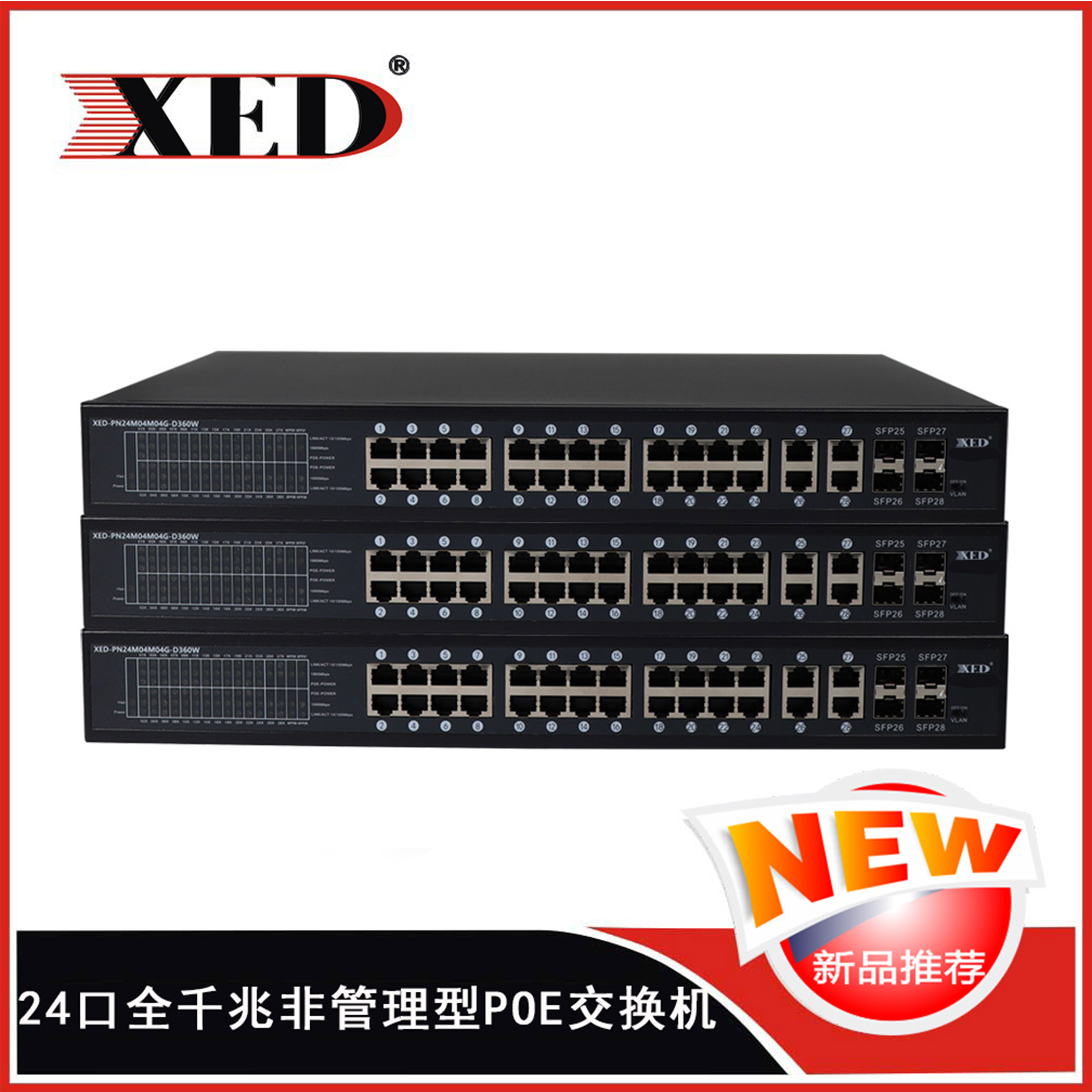 24個(gè)10/100M自適應(yīng)RJ45電口,4個(gè)千兆UPLINK端口、4個(gè)SFP端口;千兆非管理型交換機(jī)。
